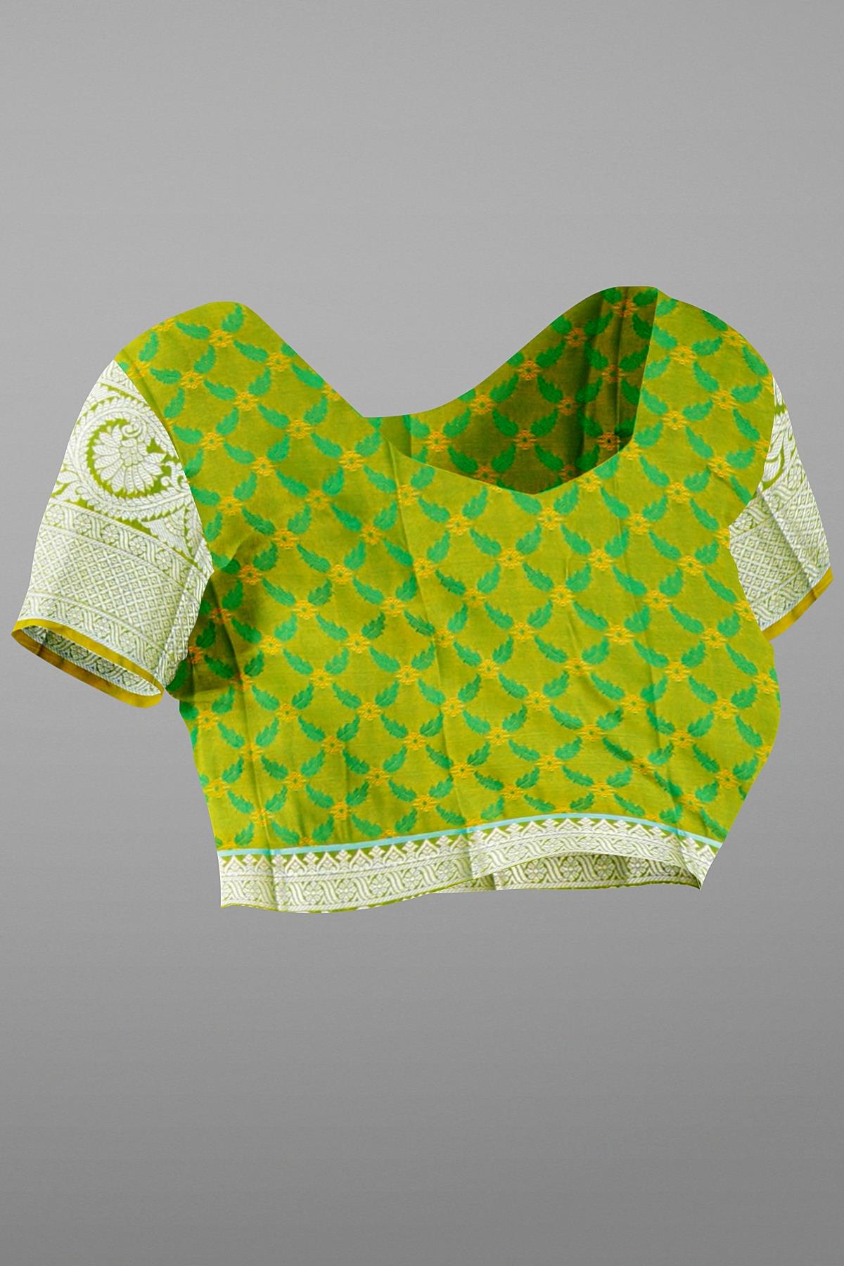Latest LIGHT GREEN FLORAL JAAL SILK BLEND Saree with SELF ZARI border. This saree comes with EMBOSE SILK BLEND blouse.