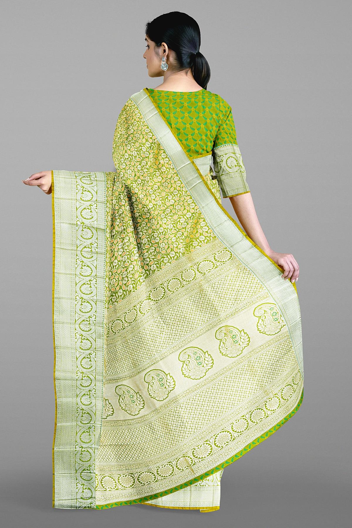 LIGHT GREEN and SILVER FLORAL JAAL SILK BLEND Saree with SEMI PATTU