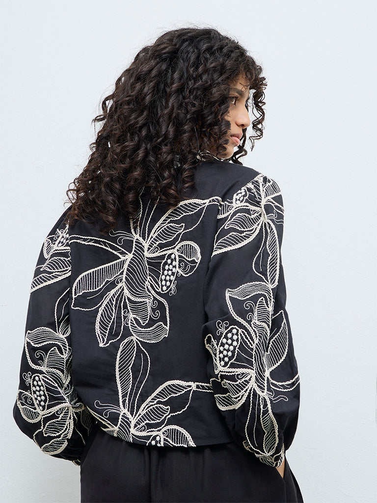 LOV Black Foliage Embroidered Cotton Blouse