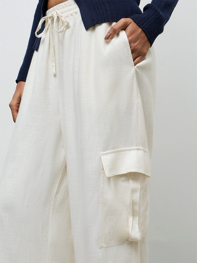 Refresh your everyday wardrobe with these off-white pants from LOV. Made from a soft, lightweight fabric that keeps the feel easy and breathable through the day, they are designed in a high-rise silhouette with an elasticated drawstring waistband for an adjustable fit. The style is completed with side pockets and flap pockets, adding a practical touch. Pair them with relaxed tops or structured shirts for effortless day-to-day styling.