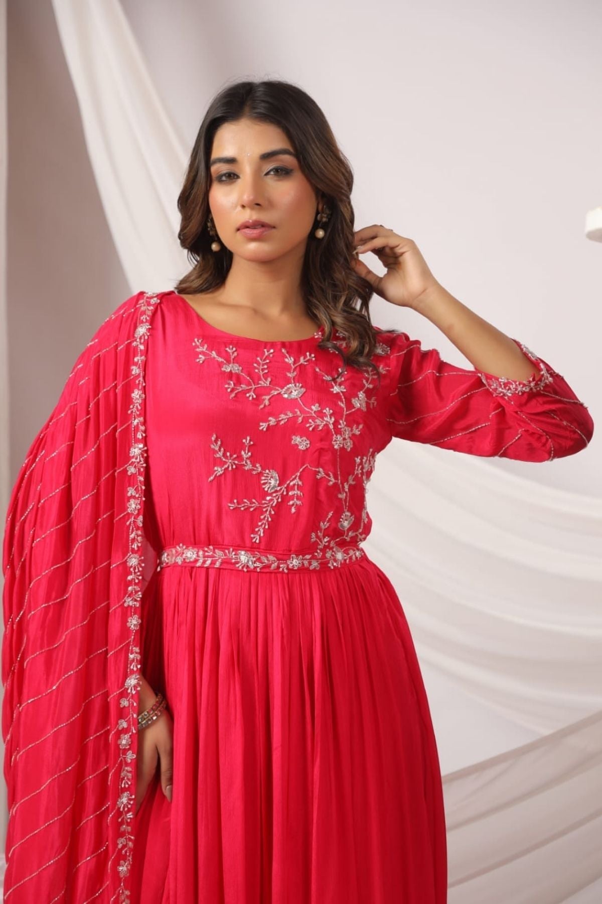 Featuring intricate zari detailing, this party wear gowns is a perfect fit for weddings, receptions, or festive evenings.