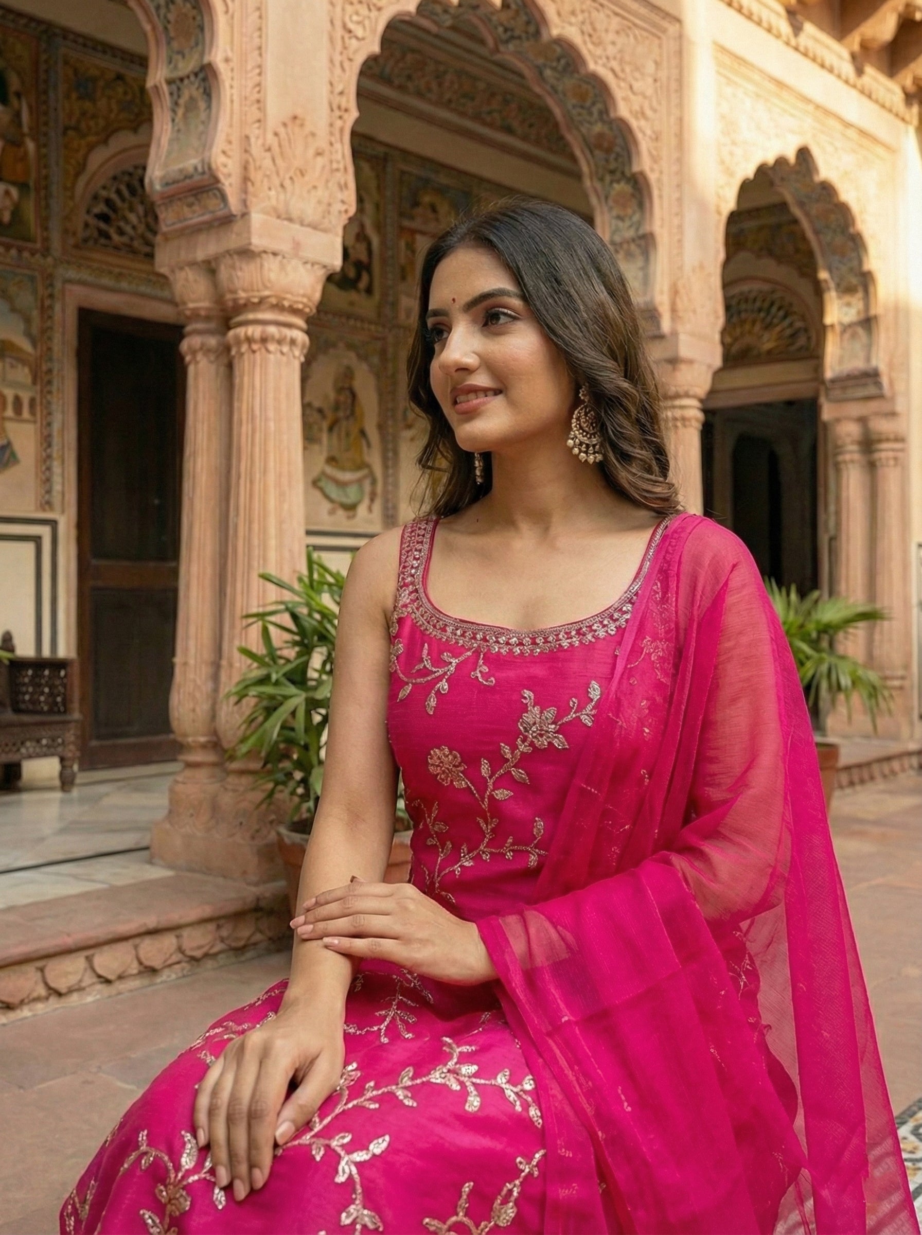 Elevate your ethnic wardrobe with this stunning magenta organza three-piece set, meticulously crafted with intricate hand embroidery. Each piece showcases traditional artistry combined with contemporary elegance, perfect for weddings, festivals, and special celebrations. The luxurious organza fabric drapes beautifully while the detailed embroidery work adds a touch of sophistication and charm. This versatile ensemble allows you to mix and match for multiple styling options, making it an investment piece that brings timeless grace to your collection.