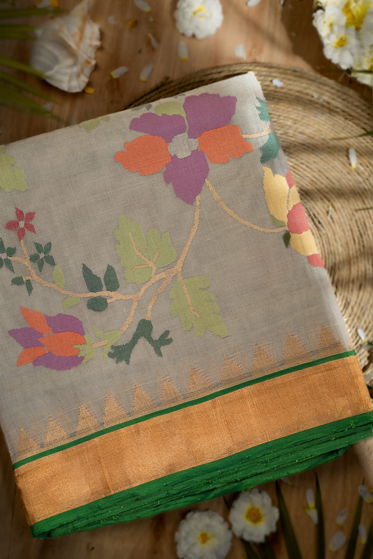 Mandir Light Grey & Green Jamdani Curvy Jaal Saree