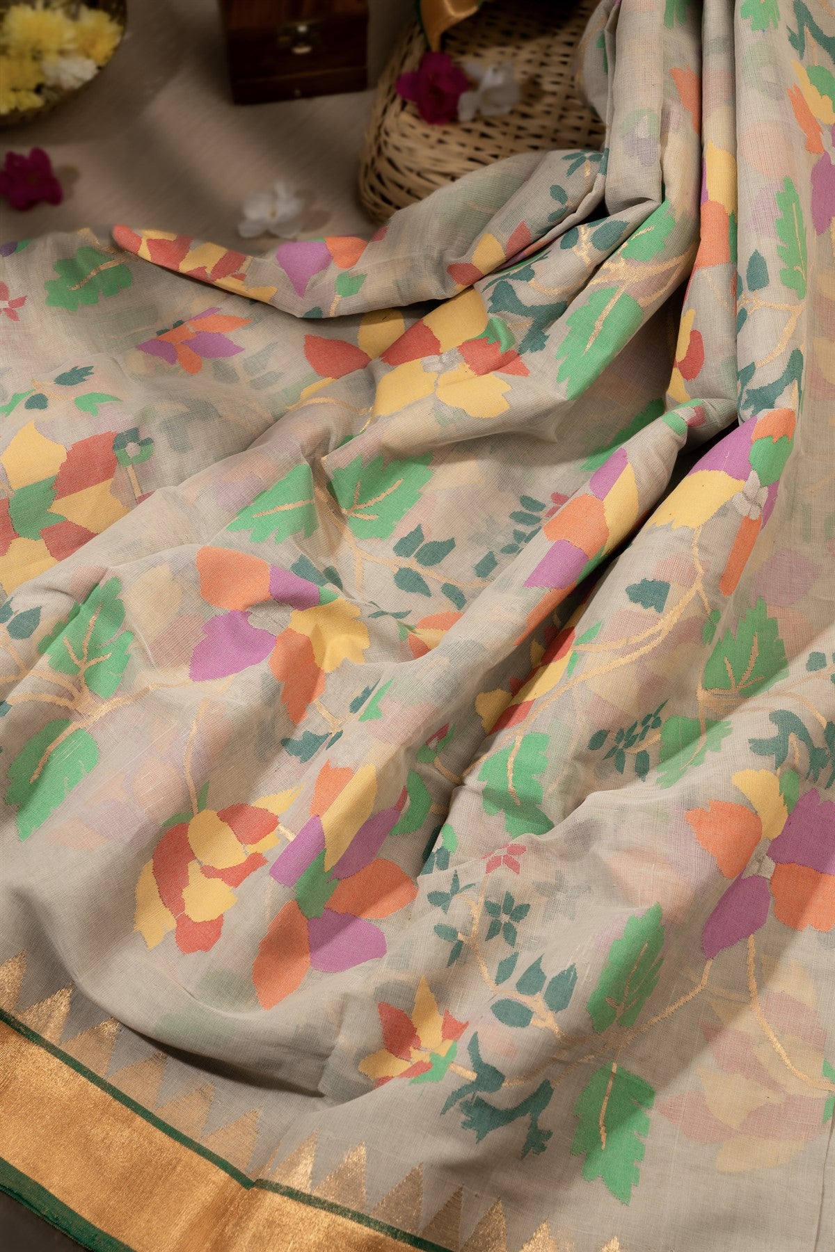 An exquisite blend of Jamdani and Khadi offers the wearer great comfort. The saree has eye-catching Meenakari Florals and Leaves Jaal work on the body and a Contrast border, as well as Kaddi with Temples border motifs and a beautifully designed Kaddi pallu, while the Self with Border blouse completes the look.