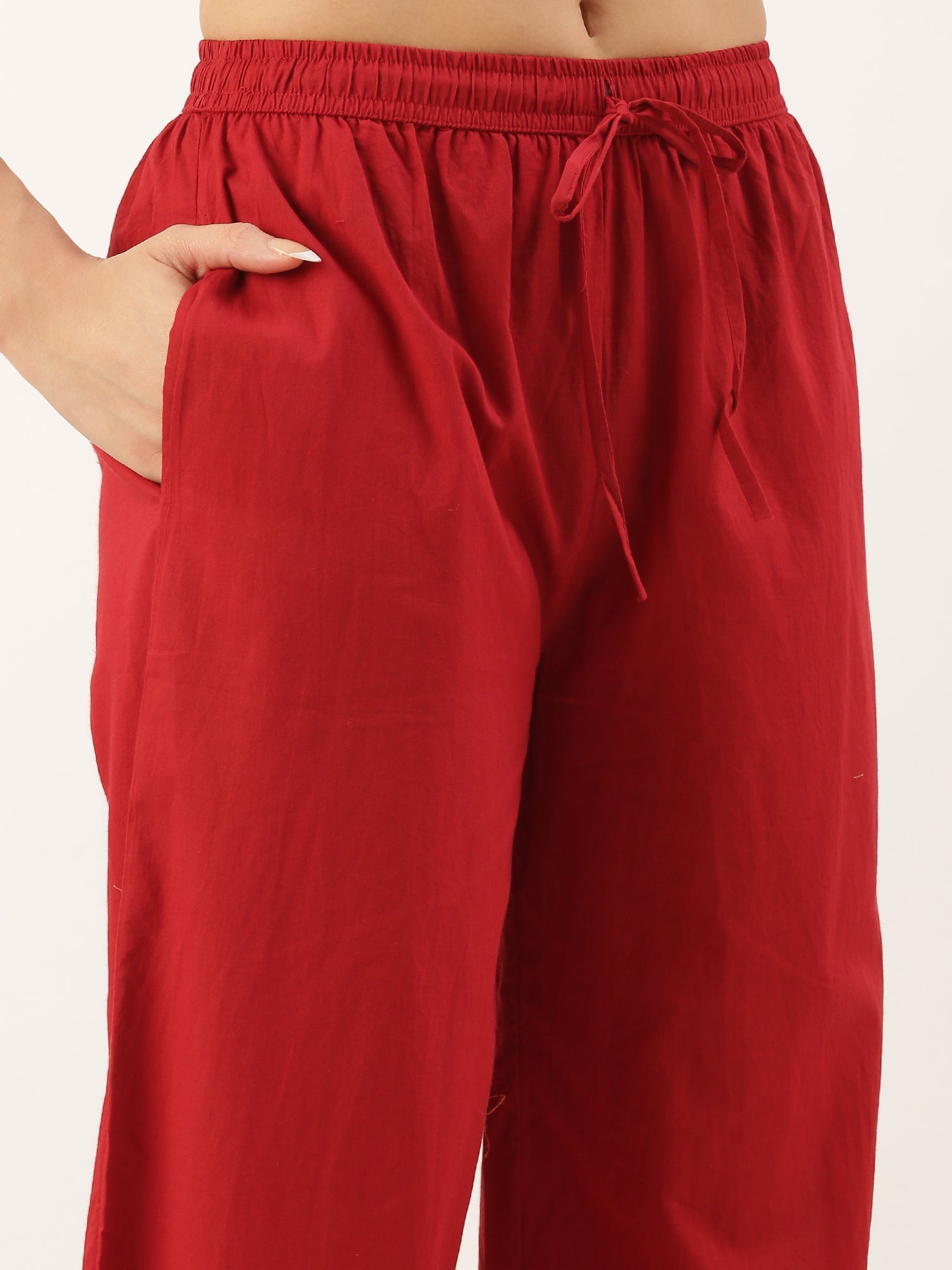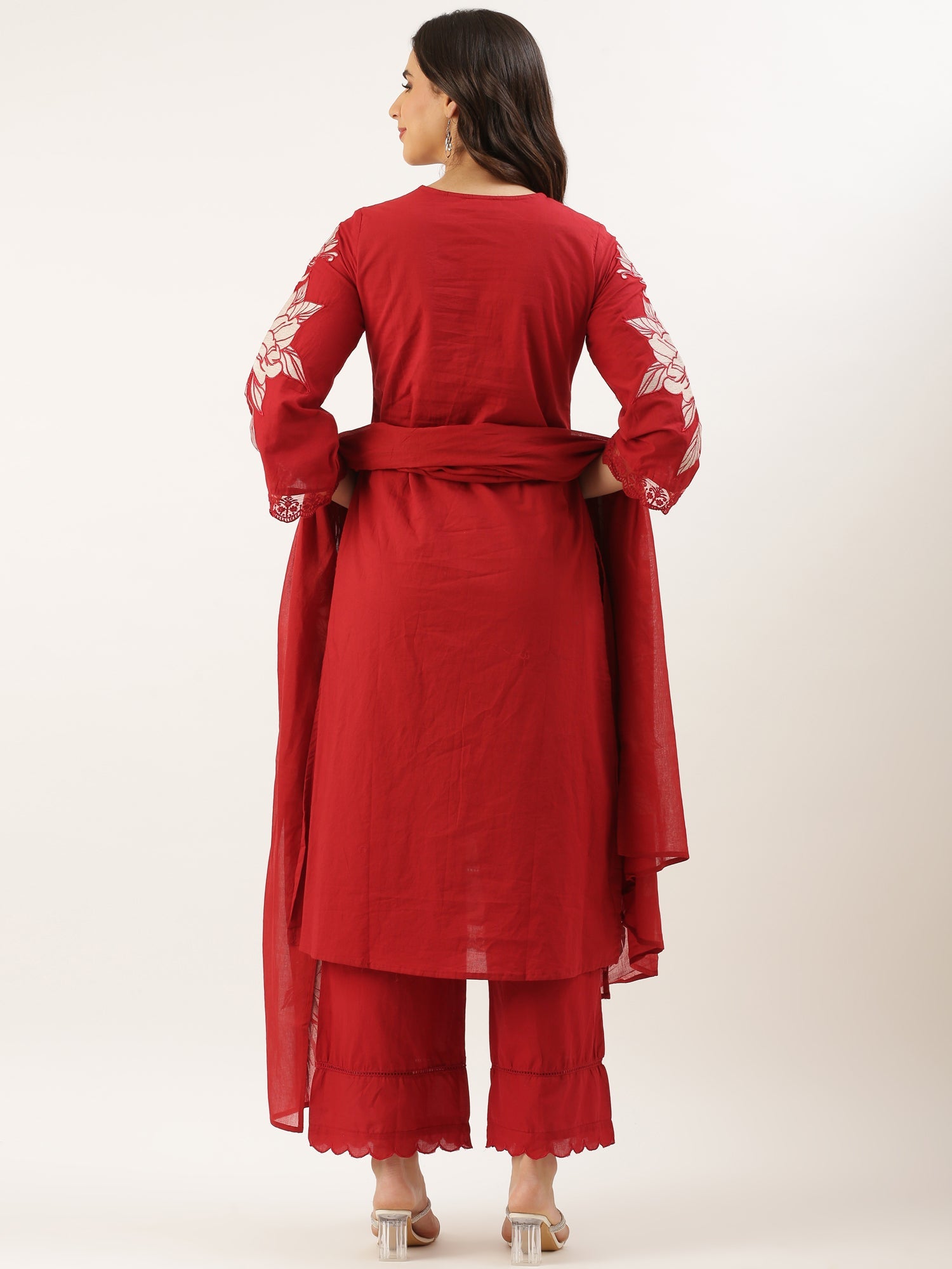 Maroon Cotton Print With Embroidery Three Piece Suit Set