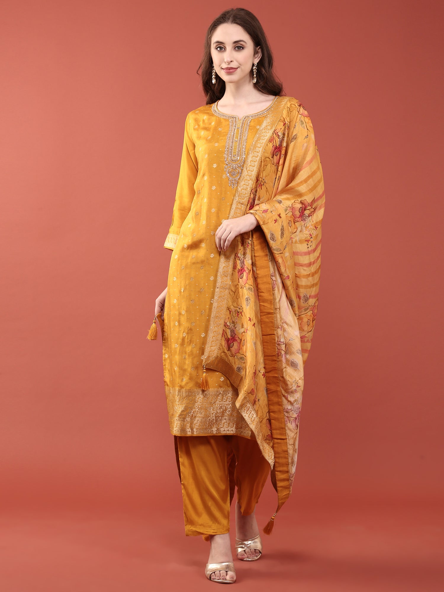 Elevate your ethnic wardrobe with this stunning three-piece ensemble crafted from luxurious mustard silk. Each piece features intricate hand embroidery and shimmering sequin work that catches the light beautifully, creating an eye-catching appeal perfect for weddings, celebrations, and special occasions. The rich mustard hue complements a variety of skin tones, while the detailed craftsmanship showcases traditional artistry. This versatile set offers you the confidence to stand out with grace and elegance, whether you're attending a festive gathering or making a statement at an event. A timeless investment piece that celebrates heritage and contemporary style.