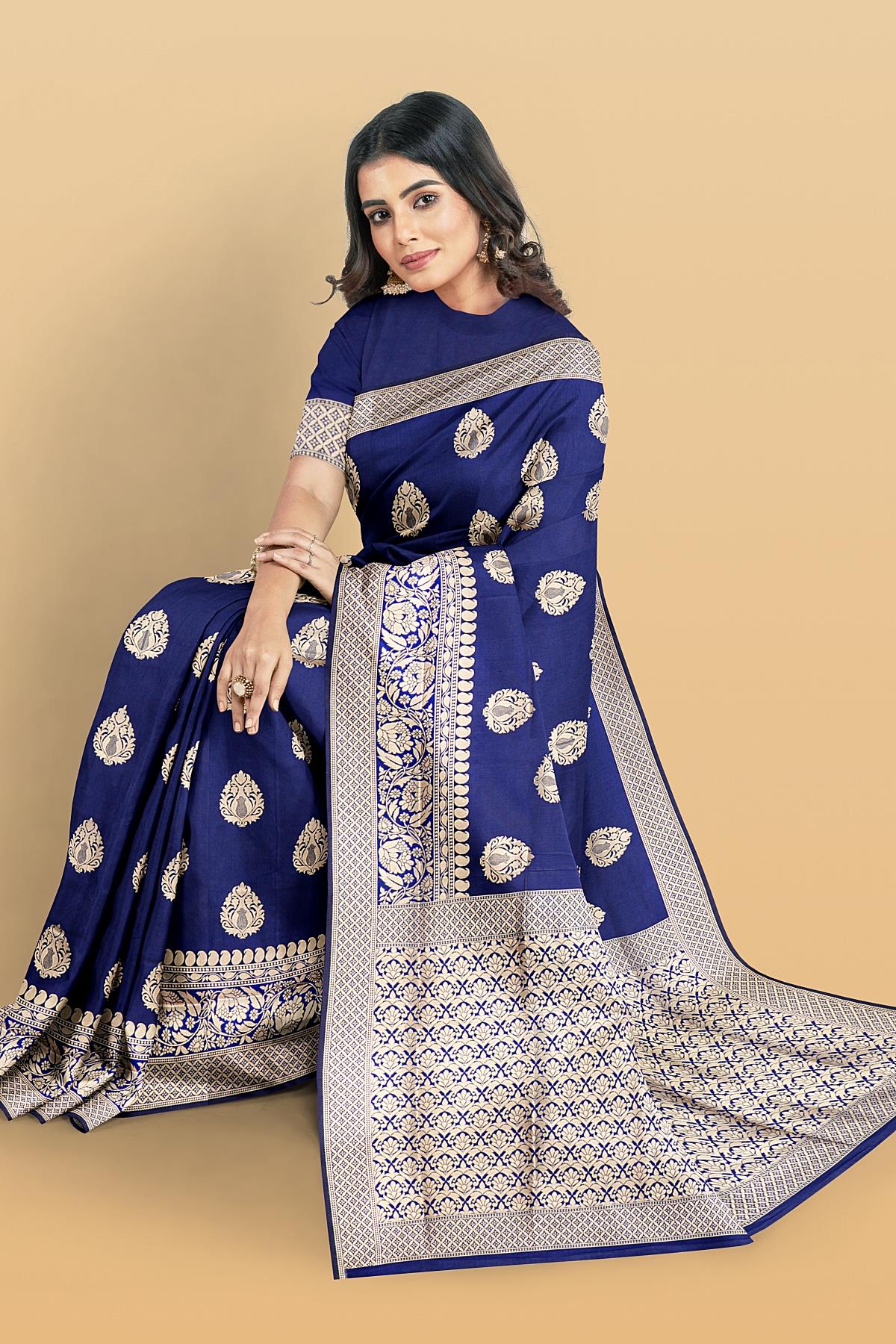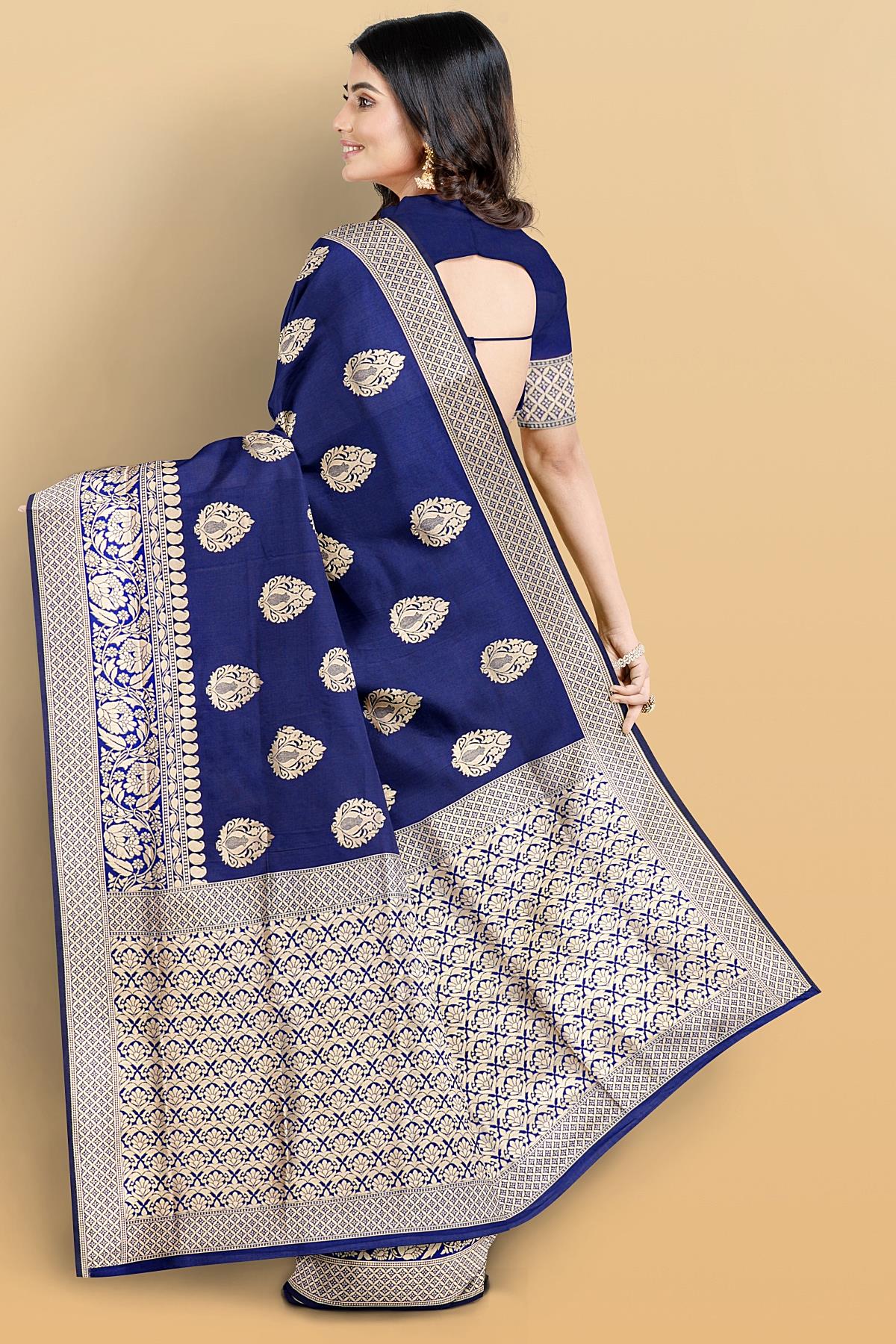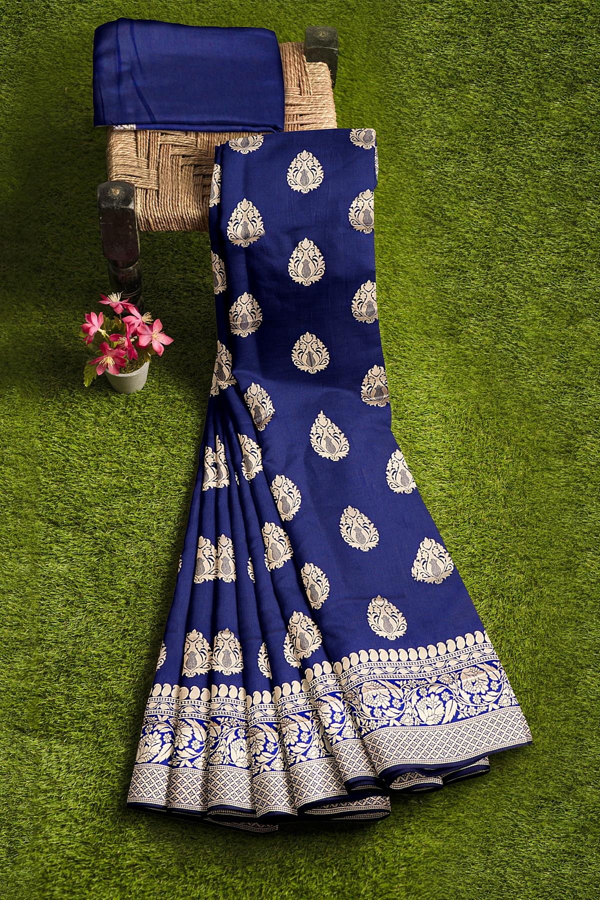 Latest NAVY BLUE BUTTIS SILK BLEND Saree with SELF ZARI border. This saree comes with PLAIN WITH BORDER SILK BLEND blouse.