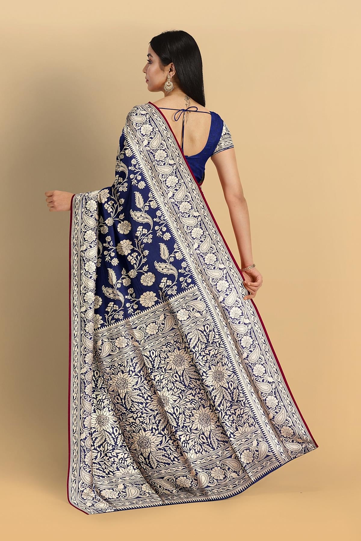 NAVY BLUE and GOLD FLORALS SILK BLEND Saree with SEMI PATTU