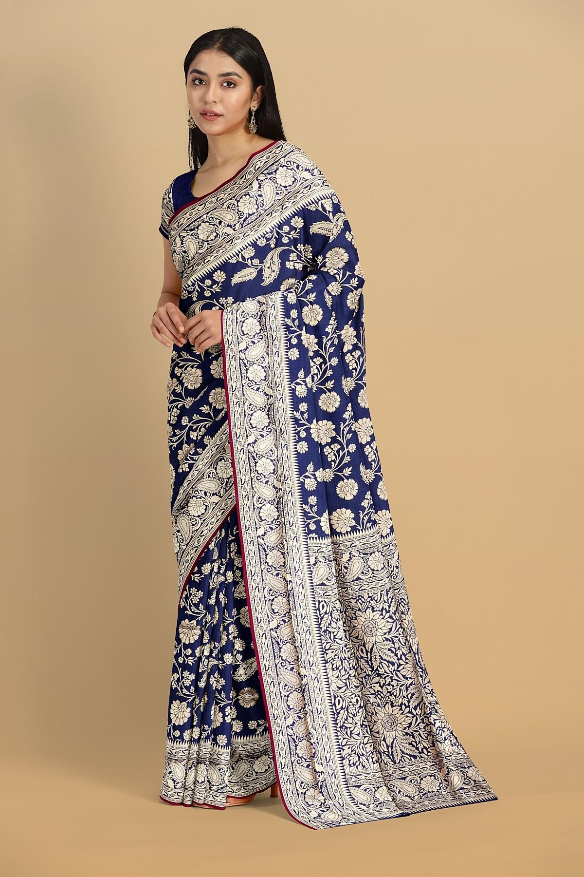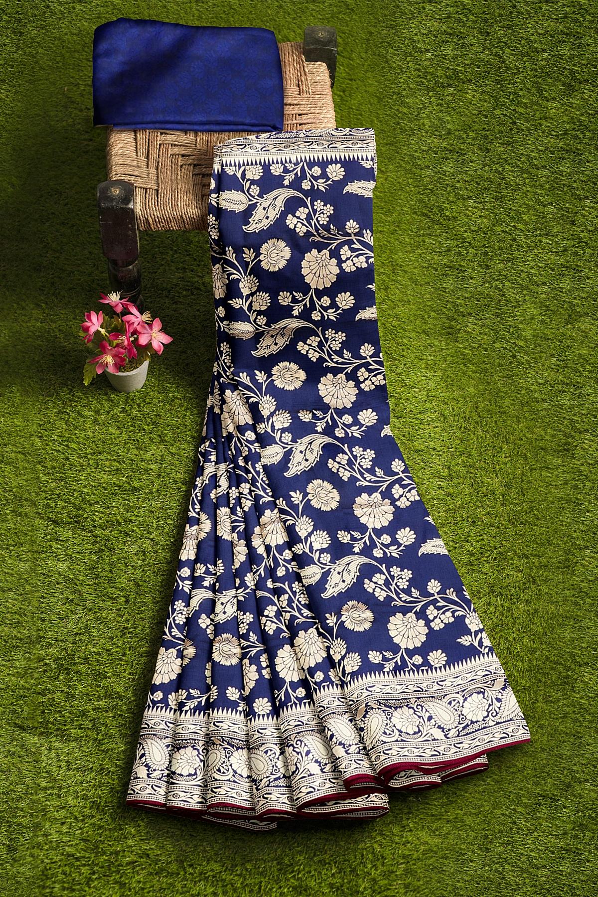 Latest NAVY BLUE FLORALS SILK BLEND Saree with SELF ZARI border. This saree comes with PLAIN WITH BORDER SILK BLEND blouse.