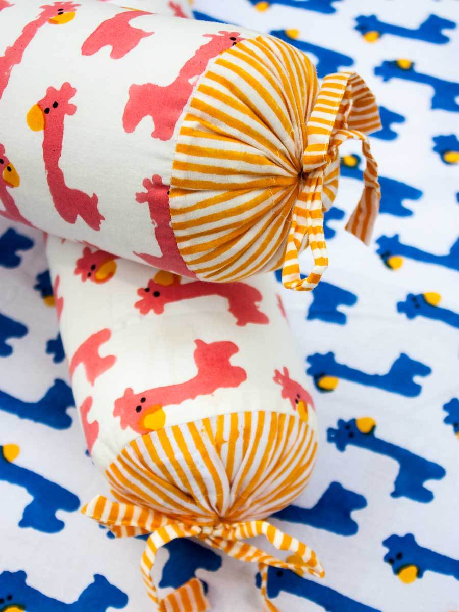 Dress up your baby's crib/cot with our lovely hand block print bolsters made with 100% GOTS certified organic cotton. The bolster cover can be easily removed for washing. This set contains two bolster pieces.