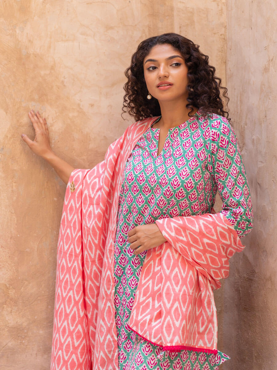 Pink Ikat Hand Block Printed Cotton Dupatta