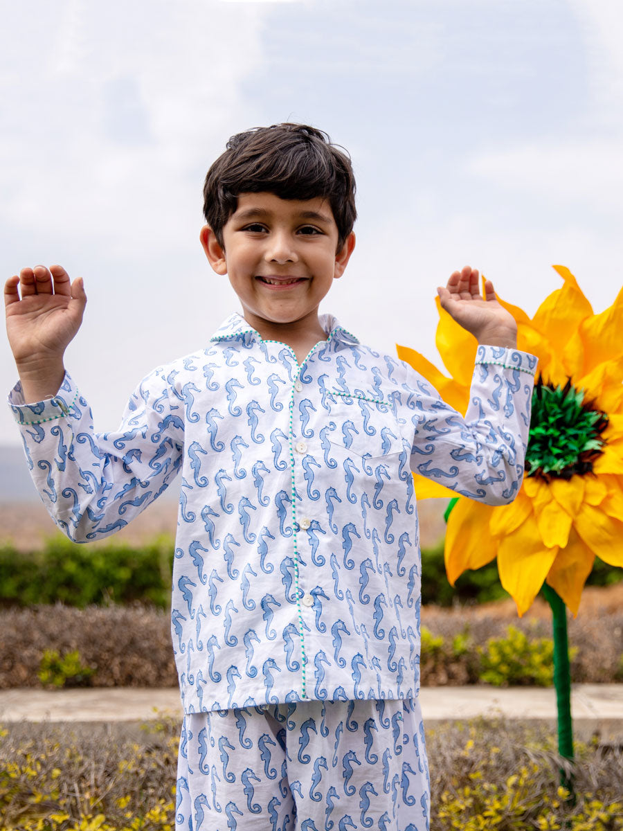 Seahorse Block Printed Cotton Top & Pyjama Set
