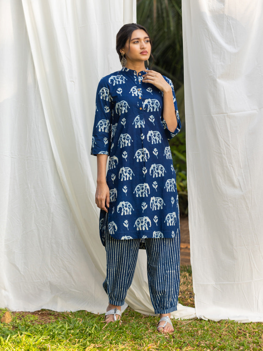 - Elegant, fine cotton, indigo kurta with lantern pants