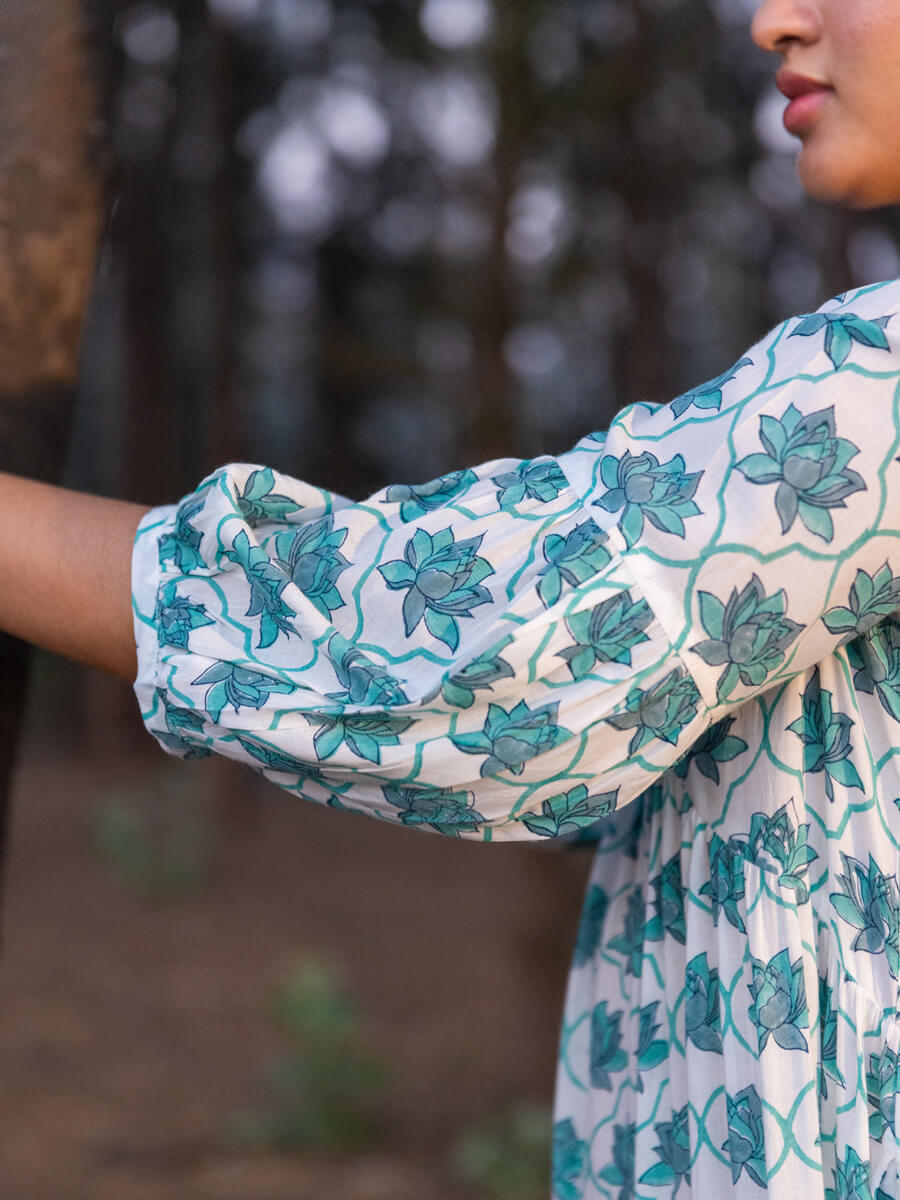 - Long maxi dress with a dense flare, a flattering neckline and comfortable sleeves