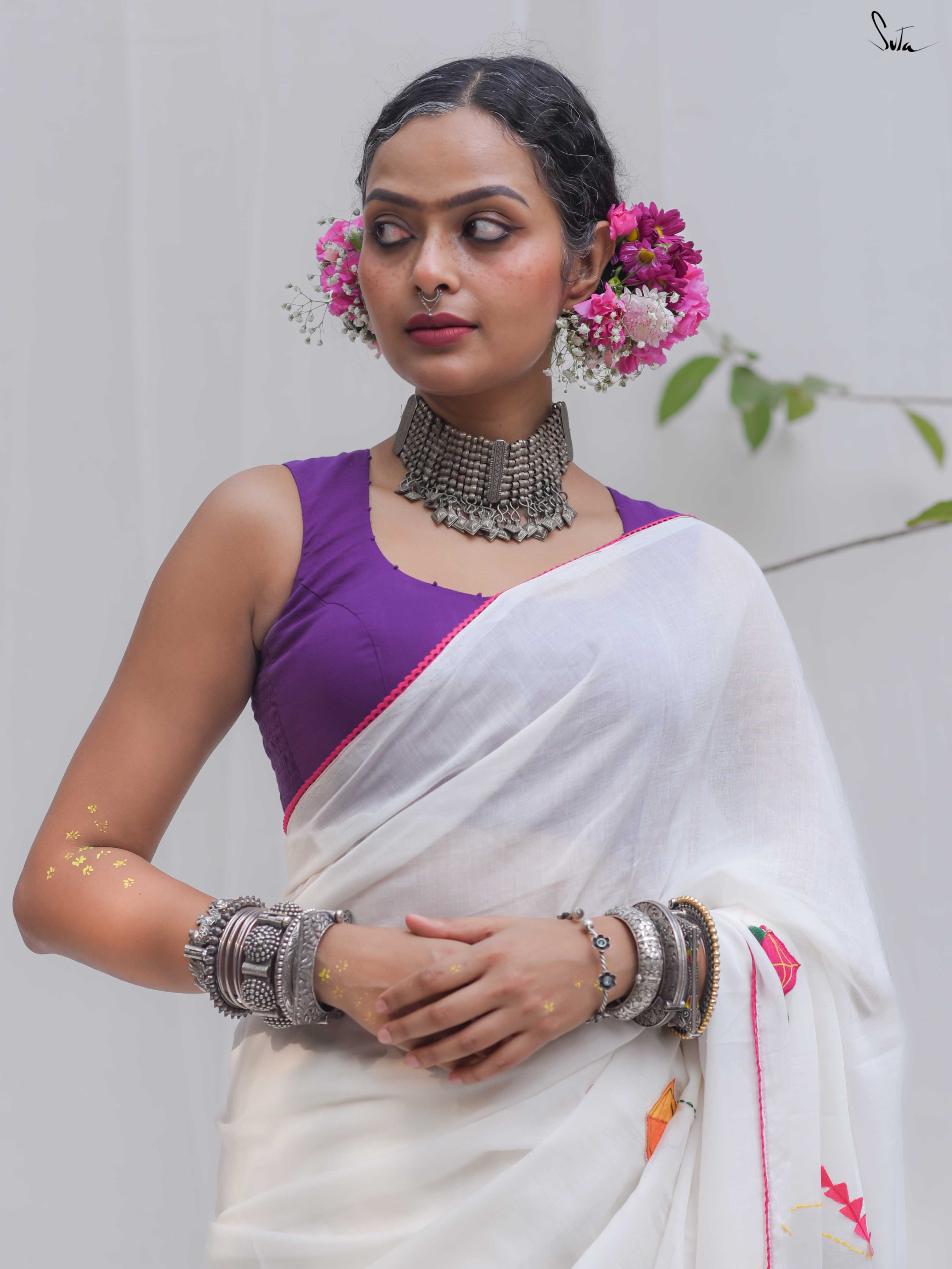 Saree:  The model is wearing a size S blouse with the saree called Patang Sa Basant