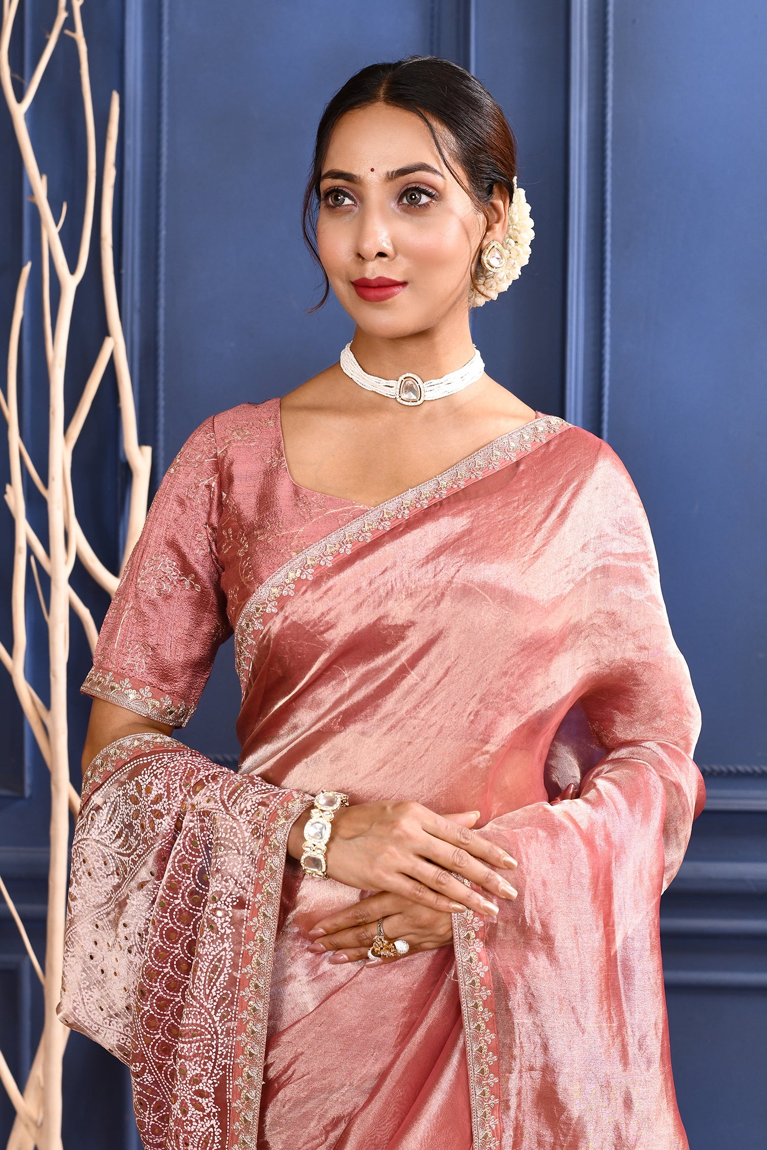 The soft pink foil printed tissue saree with embroidered self border and blouse for a rich look along with foil printed floral design for subtle grace.
