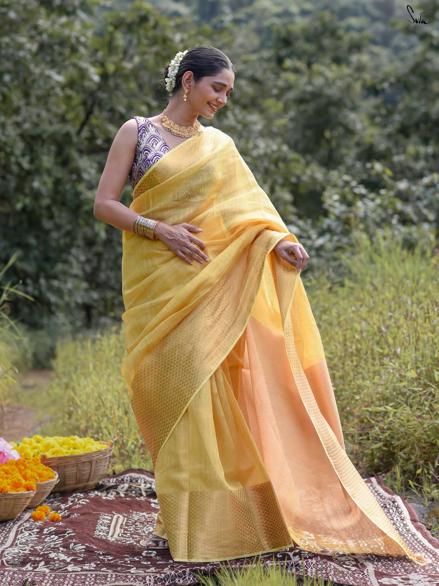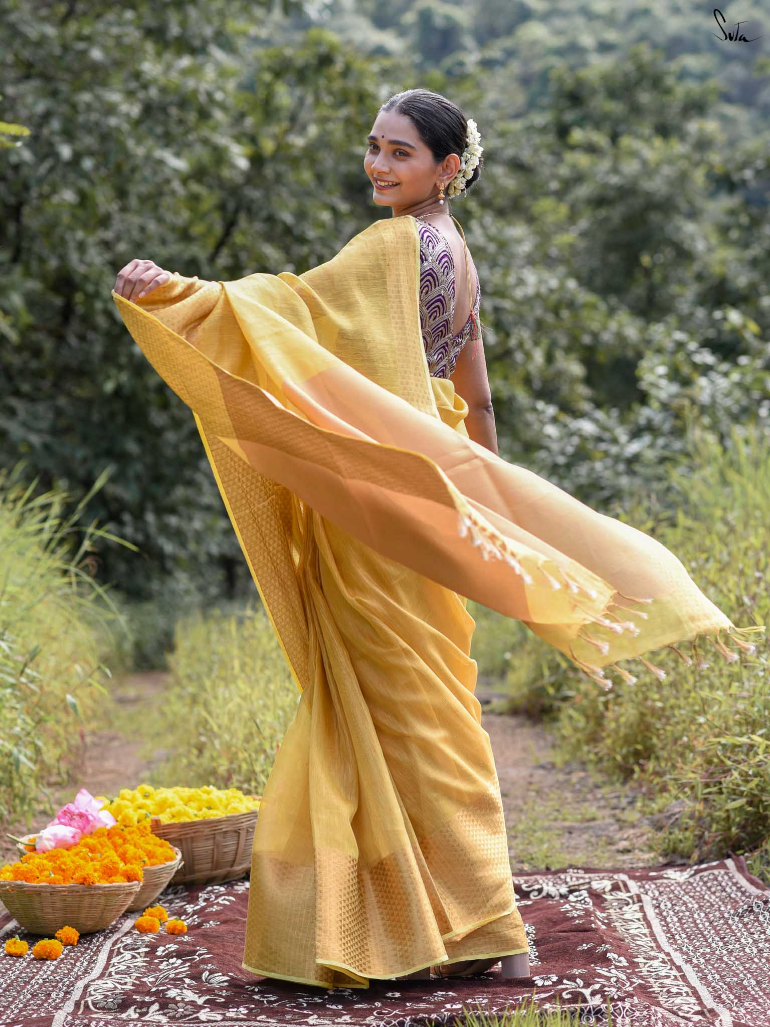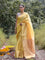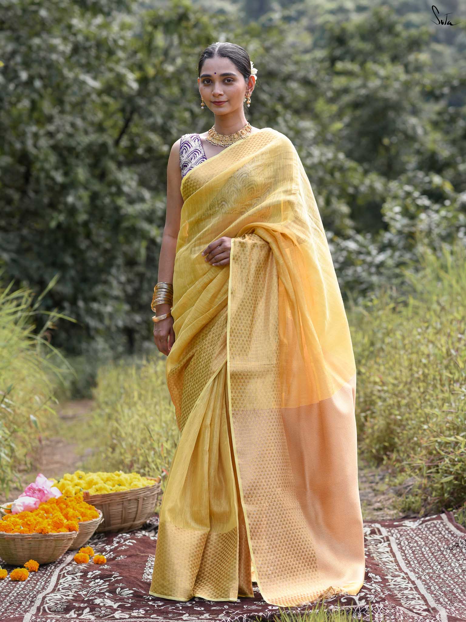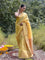 A yellow saree that feels like pure sunshine. The colour radiates warmth and optimism, lighting up every room you walk into. The geometric zari border adds structure and shimmer, keeping the look festive yet refined. Perfect for weddings and joyful celebrations. Comes with a matching blouse piece, no fall.