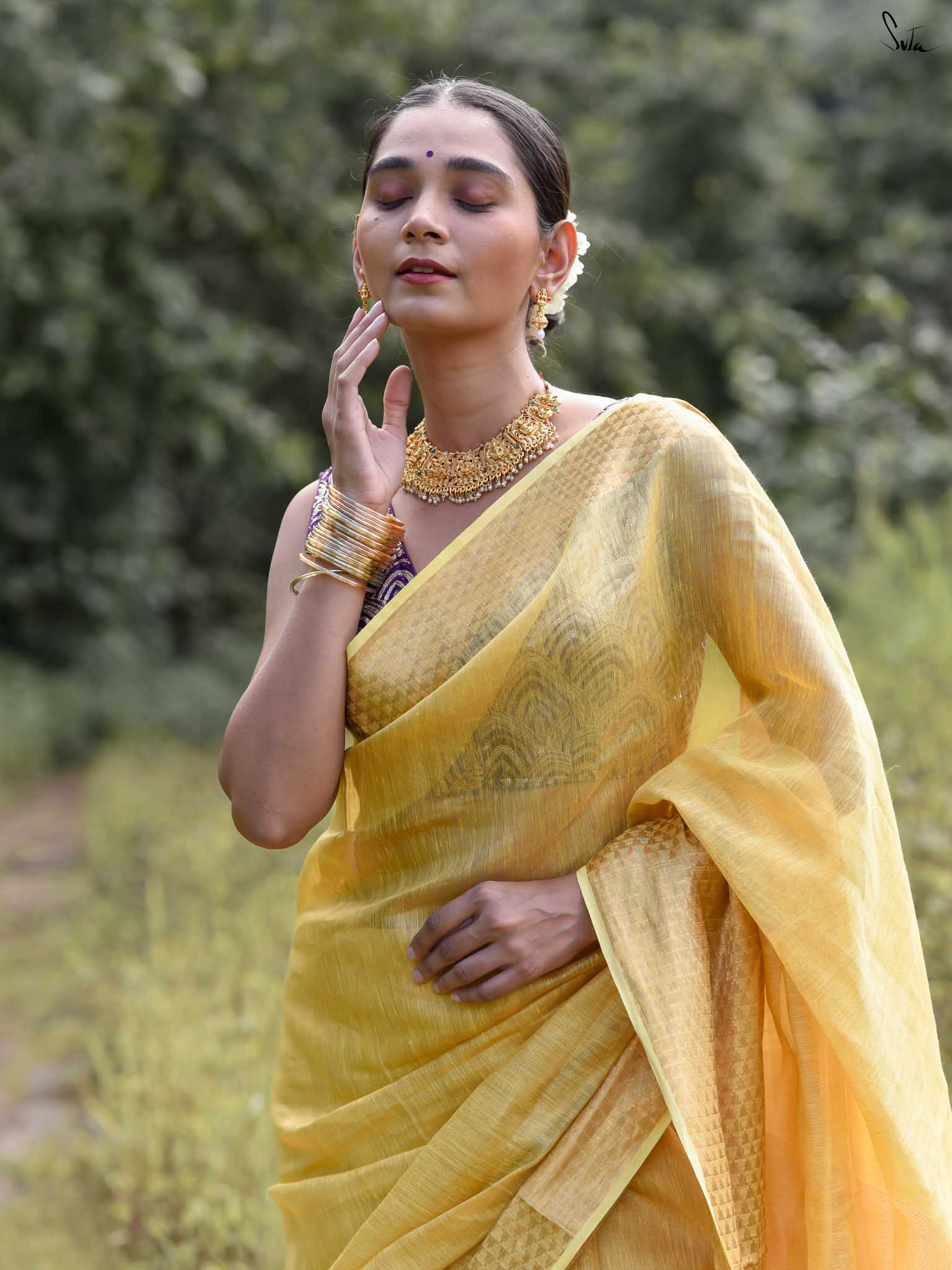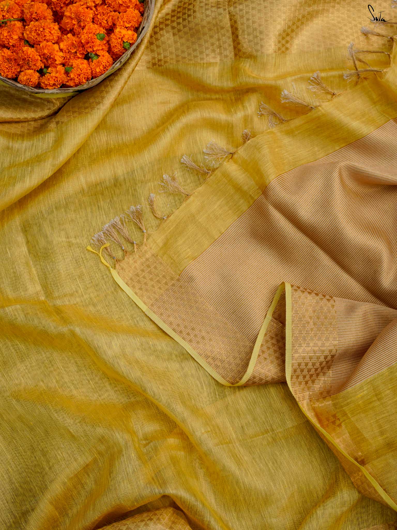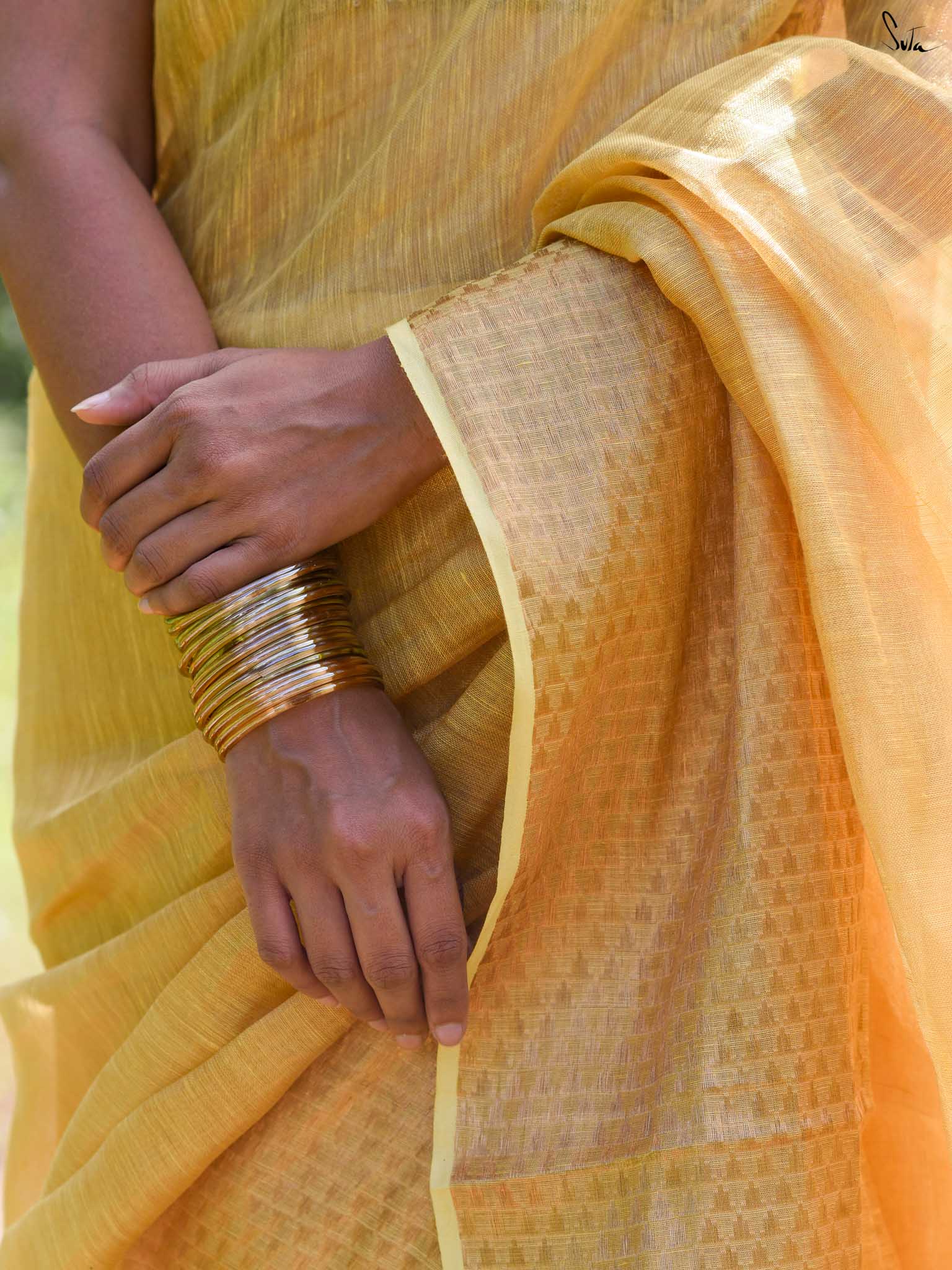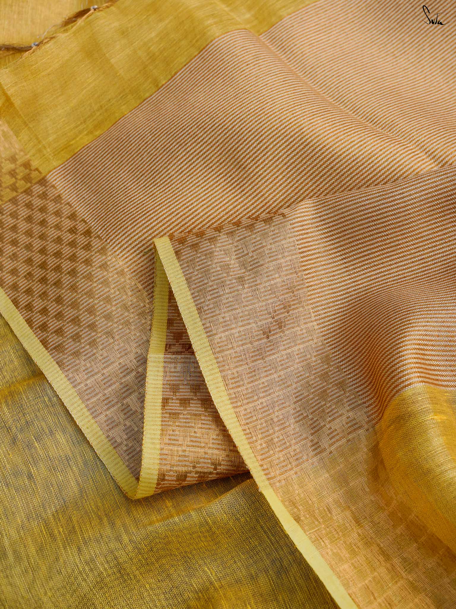 A yellow saree that feels like pure sunshine. The colour radiates warmth and optimism, lighting up every room you walk into. The geometric zari border adds structure and shimmer, keeping the look festive yet refined. Perfect for weddings and joyful celebrations. Comes with a matching blouse piece, no fall.